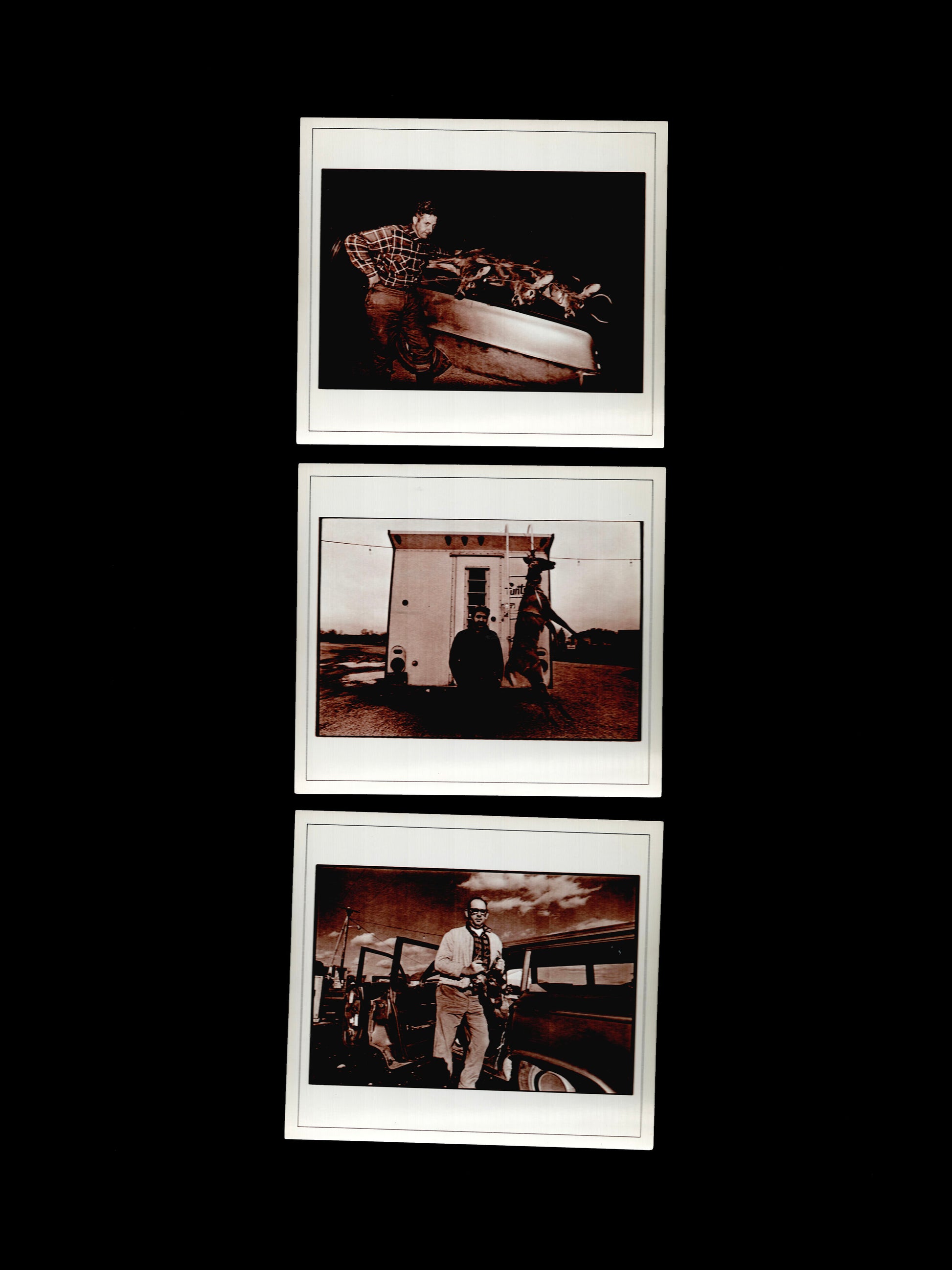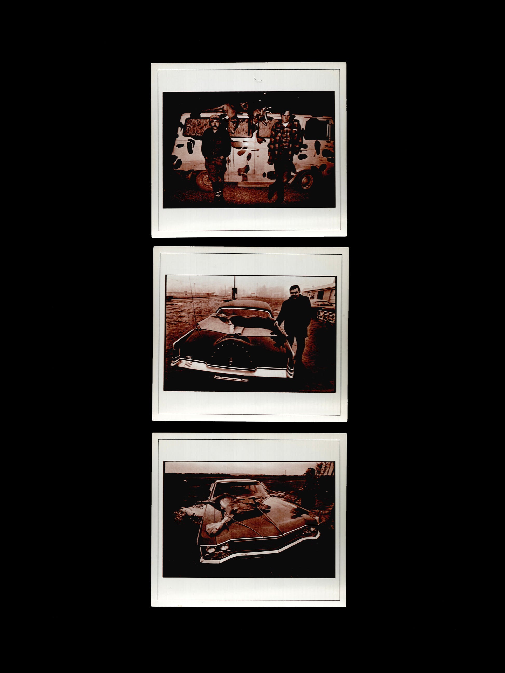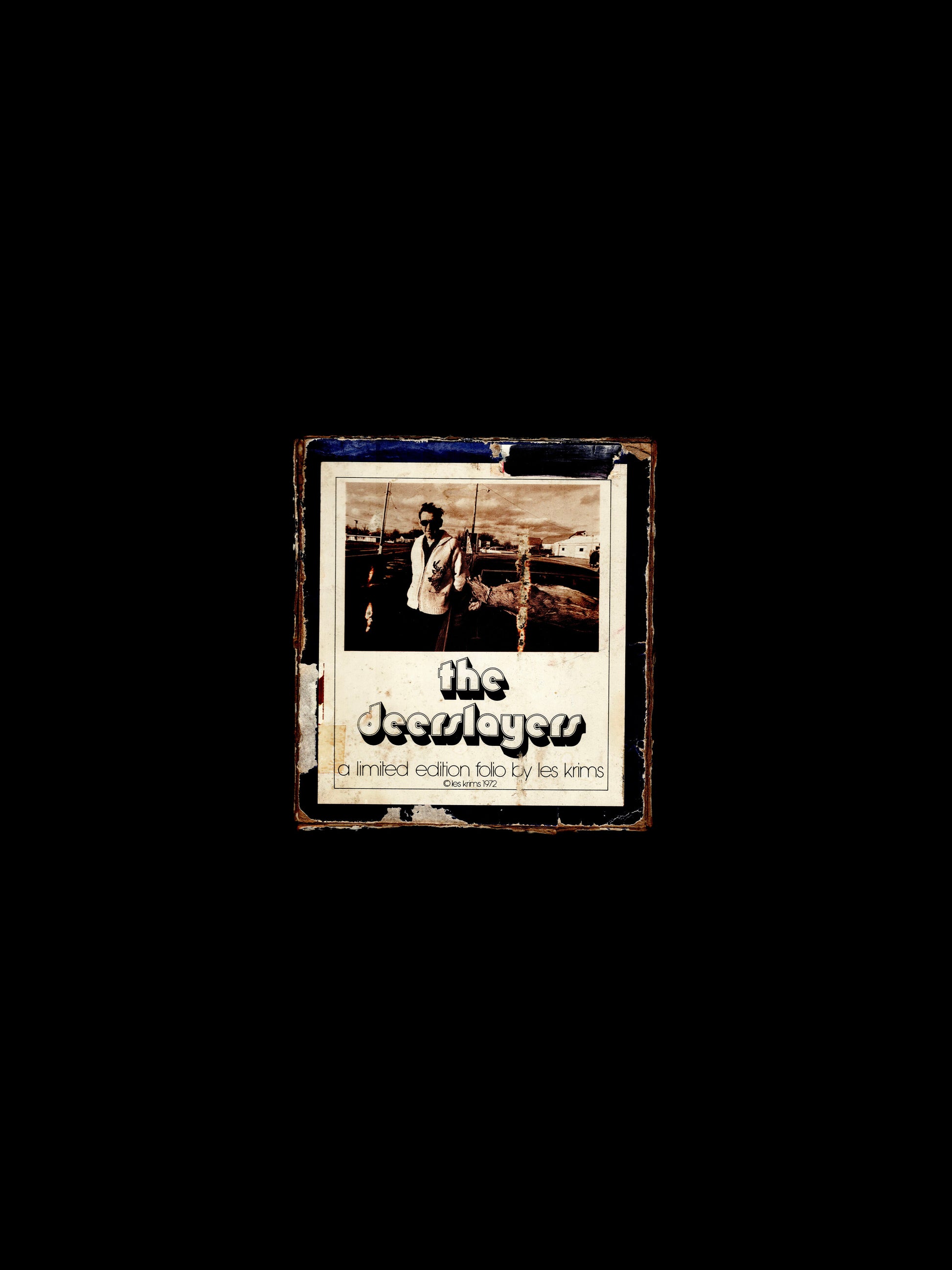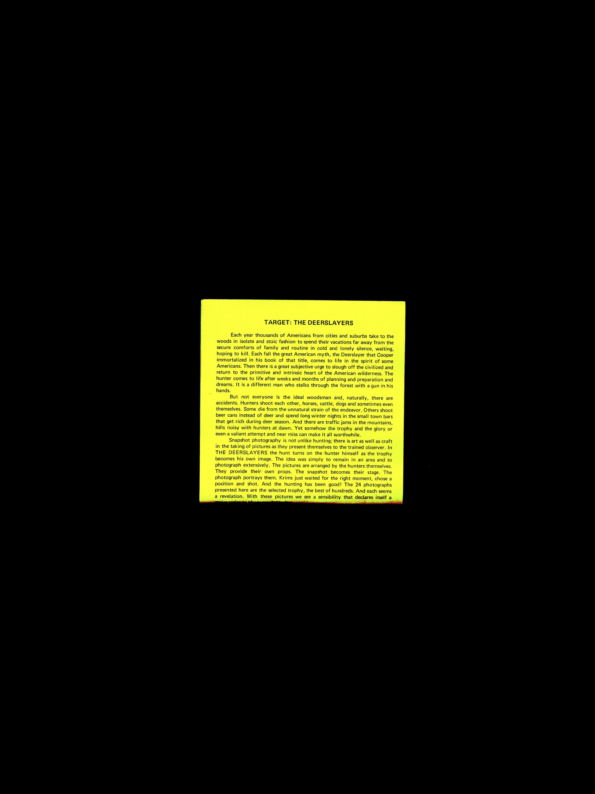 Les Krims' 1972 portfolio of 22 prints. In this rare portfolio, Krims took pictures of deer hunters who had voluntarily stopped at "deer check stations" so that NYS conservationists could examine the general health of the deer. Pictured posing with their kills, Krims suggested the hunters had much in common with performance art and odd manifestations of sculpture. He also attempted to underscore the American nature and long tradition of deer hunting as one aspect of a criticism of animal rights and anti-Vietnam War activists. The box is beaten up, but the text and all the prints are there and in great condition.