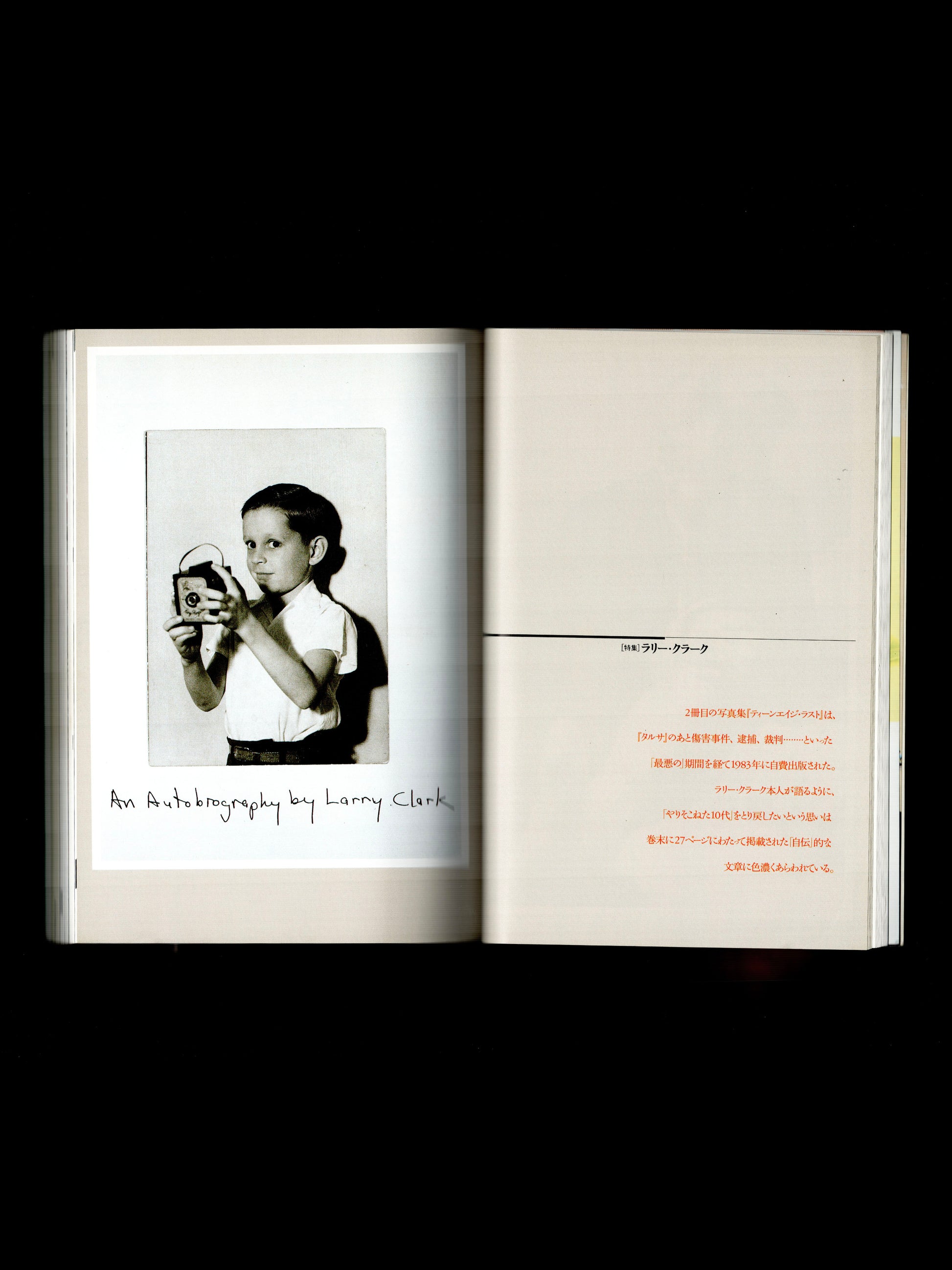 Founded in 1948, Bijutsu Techo is a monthly art magazine in Japanese, focusing primarily on contemporary art, fashion and photography. This Larry Clark special features 47 pages dedicated to Clark, including selections of images from Kids (film stills), directed by Clark and Tulsa, and an interview with Larry Clark (in Japanese). Also includes features on Andres Serrano and Hiroshi Sugimoto. Text in English and Japanese. Scarce.