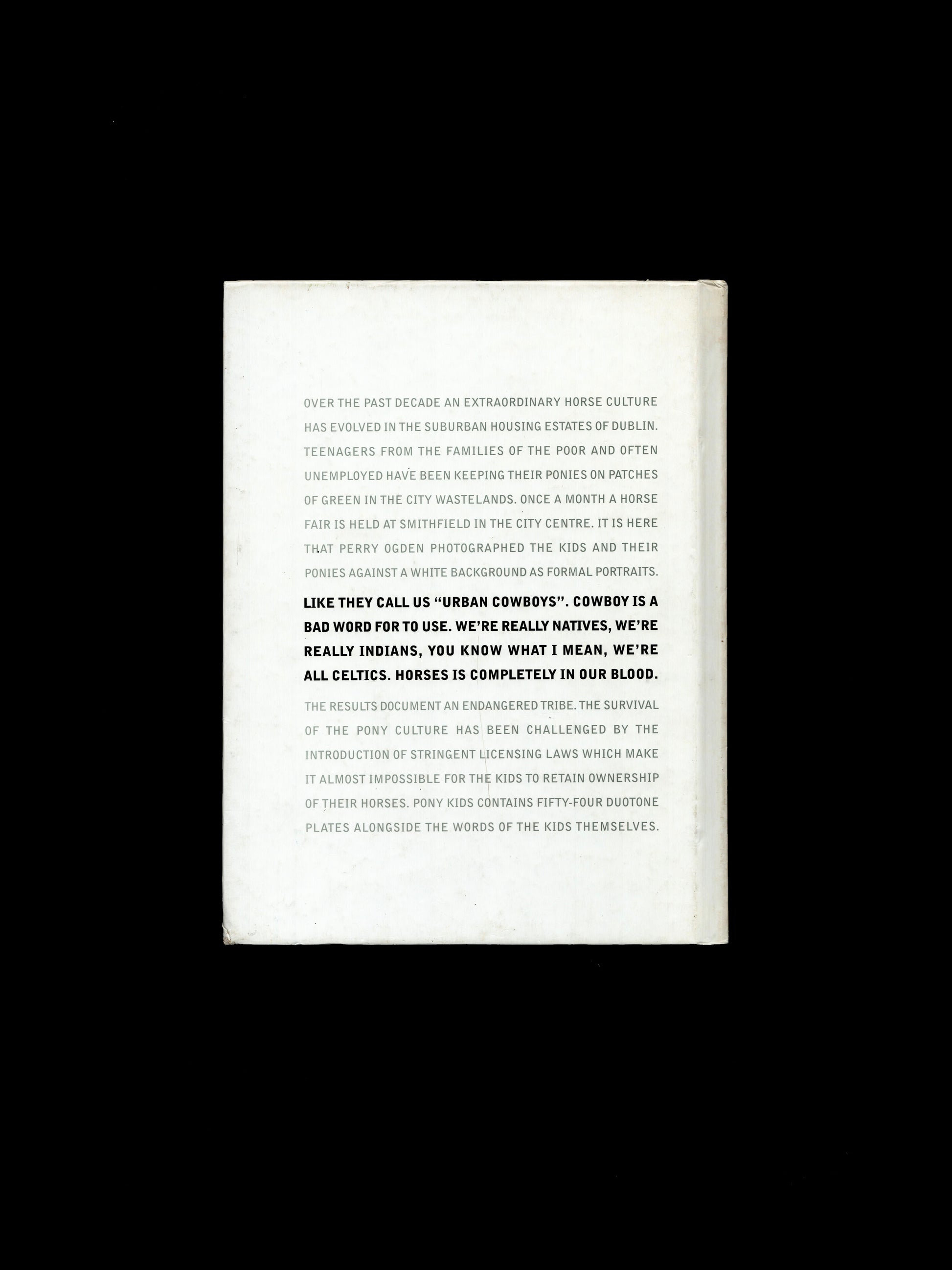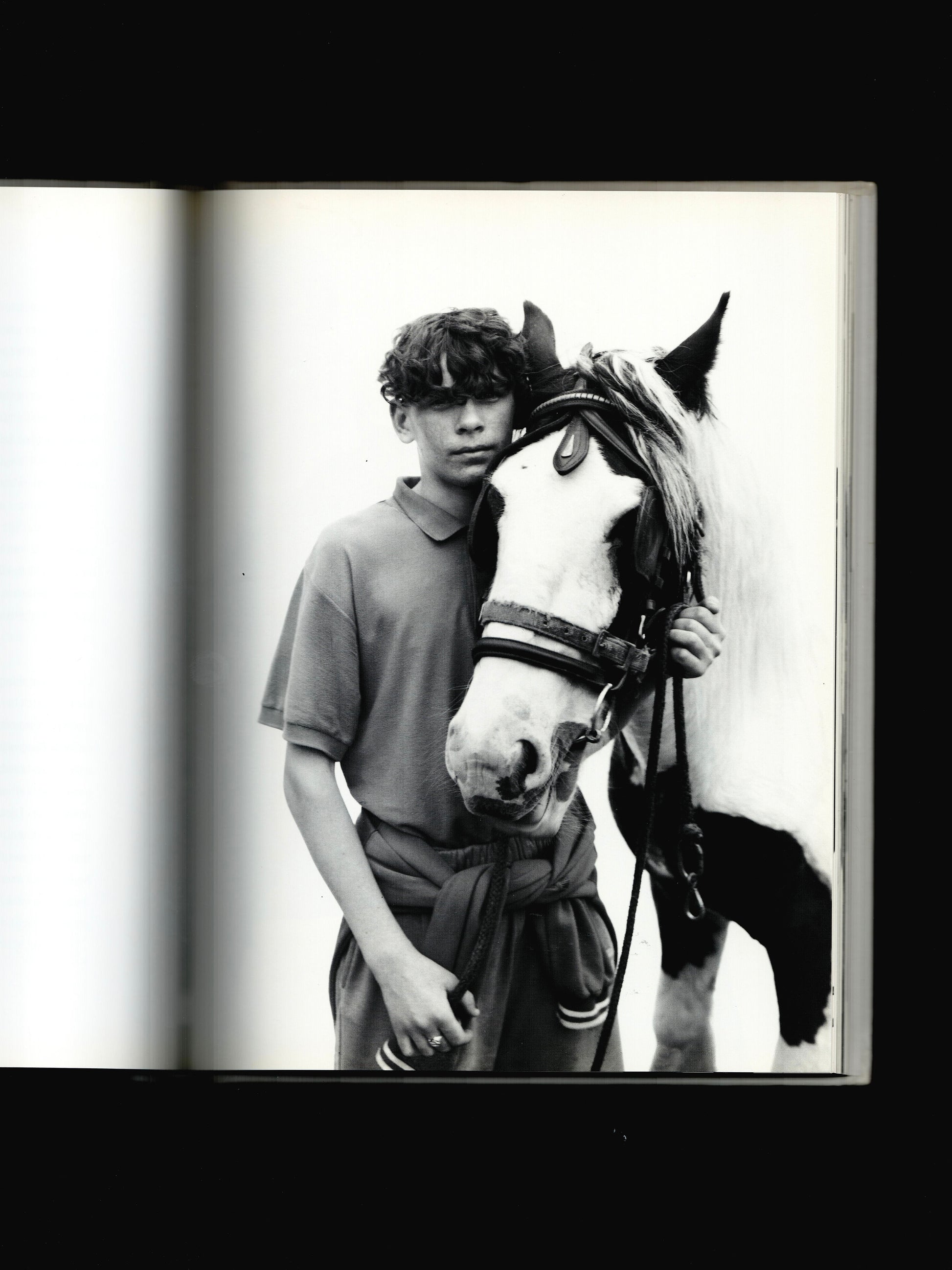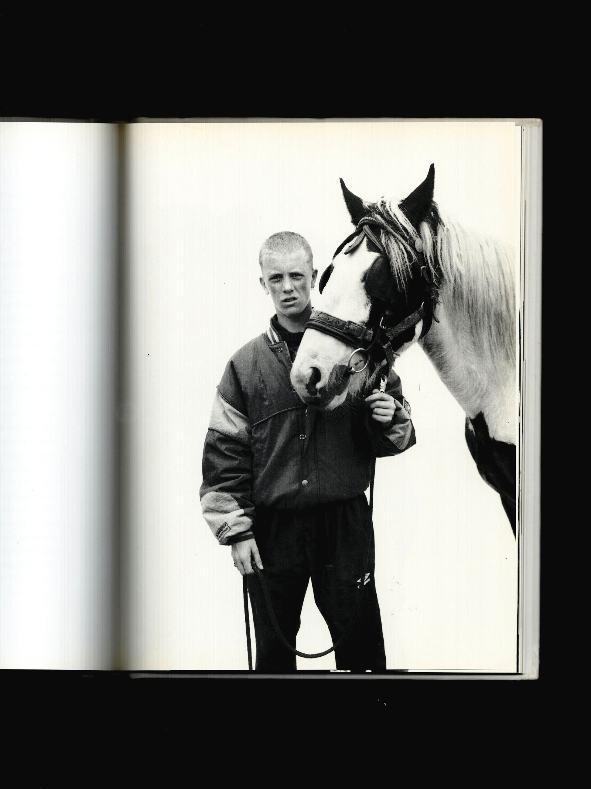 During the 1990s, an extraordinary horse culture evolved in the suburban housing estates of Dublin. Teenagers from the families of the poor and often unemployed have been keeping their ponies on patches of green in the city wastelands. Once a month, a horse fair is held at Smithfield in the city centre. It is here that Perry Ogden photographed the kids and their ponies against a white background as formal portraits.